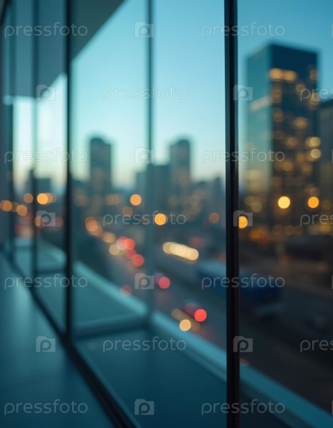 Размытая перспектива демонстрирует современный городской горизонт через стеклянную стену во время сумерек, раскрывая динамичность и сложность городской жизни. Угасающий свет отражает энергию города. Генерирующий ИИ