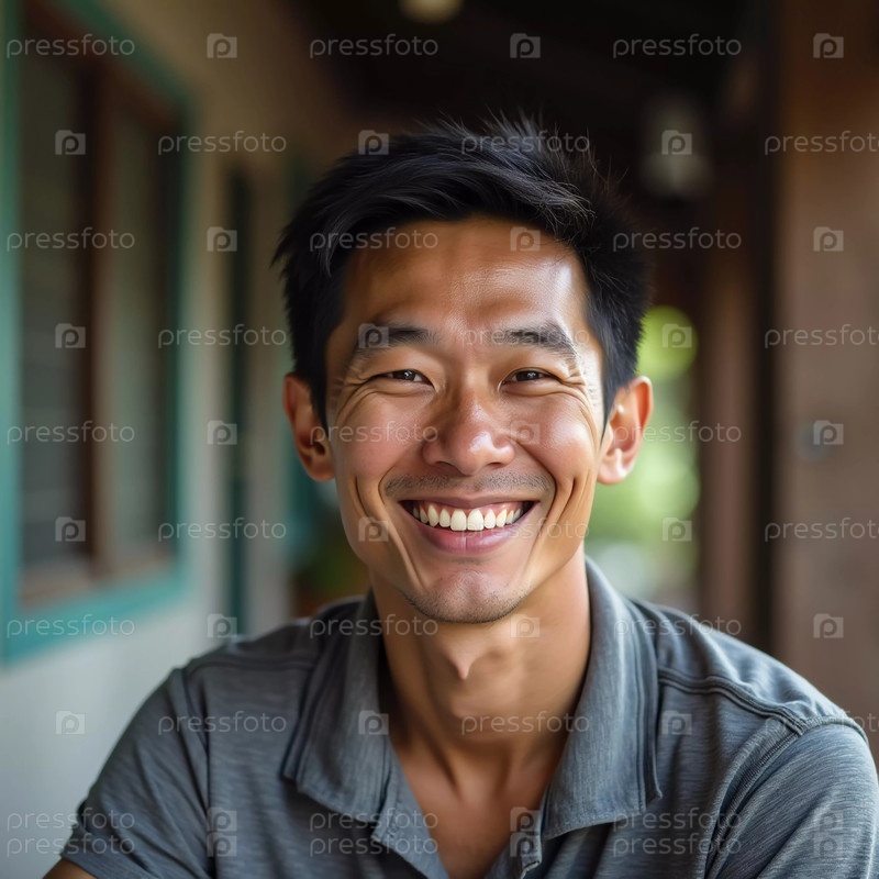 Веселый мужчина в случайной серой рубашке ярко улыбается, сидя на открытом воздухе в Таиланде. Его дружелюбное поведение отражает местную культуру и гостеприимство в спокойной обстановке. Генерирующий ИИ