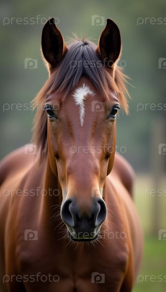 Коричневая лошадь изящно стоит на открытом поле, ее выразительные глаза отражают мягкий свет, создавая спокойную атмосферу в пейзаже