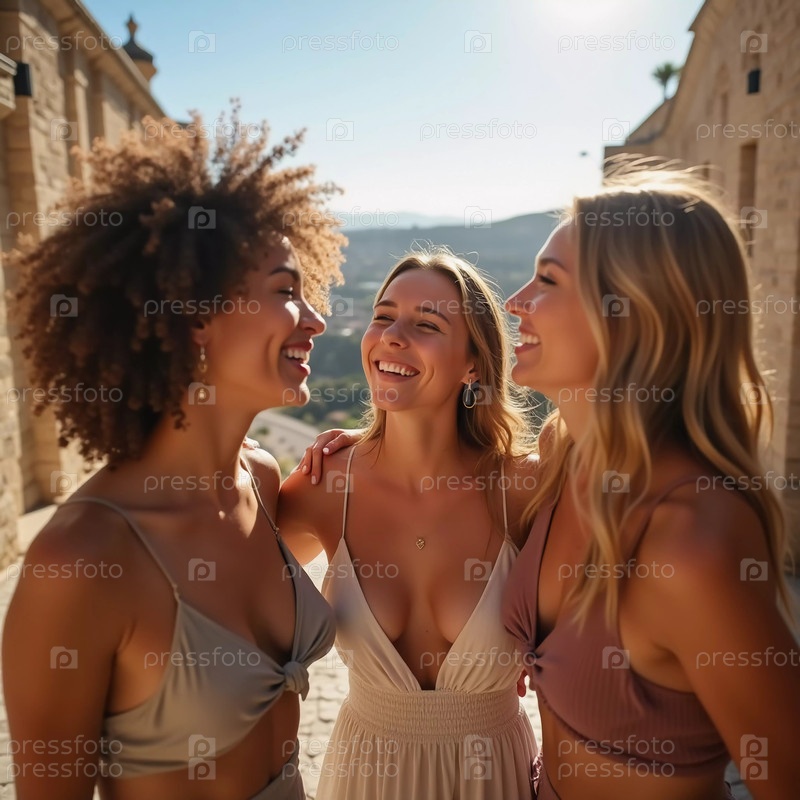 Друзья исследуют очаровательное средиземноморское место, делясь радостными моментами и смехом, греясь на теплом летнем солнце и потрясающей архитектурой. Красивые молодые девушки. Генеративный ИИ
