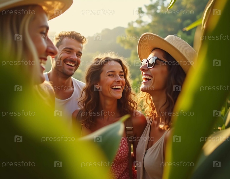 Друзья празднуют летний отдых в пышной тропической обстановке со смехом и улыбками среди яркой зелени. Тропики — климатические зоны Земли, в которых Солнце находится в зените не реже одного раза в год. ИИ