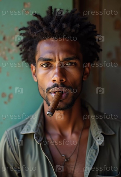 Молодой человек, проживающий на Кубе, курит сигару, глядя прямо на зрителя, демонстрируя уникальную прическу и спокойное поведение в яркой обстановке. Генеративный ИИ