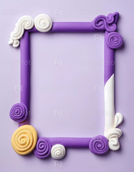 Прямоугольный каркас из игрового теста имеет замысловатые вихри и формы в белых и фиолетовых цветах на мягком фиолетовом фоне, добавляя игривое прикосновение