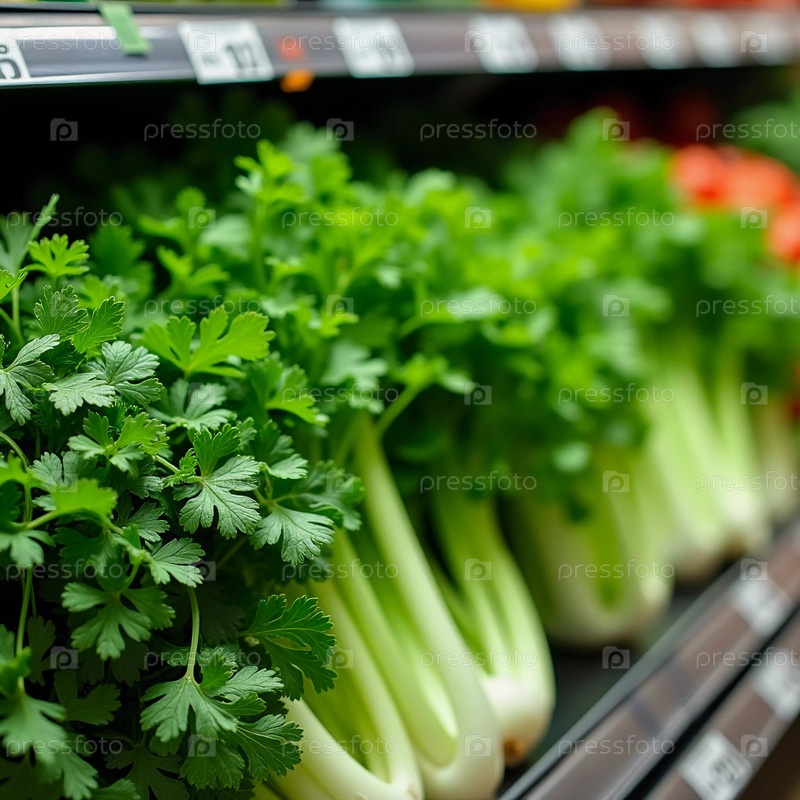 Пышная зелень заполняет полки яркого супермаркета, демонстрируя свежую петрушку и сельдерей, готовые для покупателей. Солнечный свет освещает травы, усиливая их привлекательность