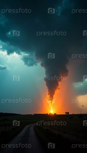 Когда сумерки падают, свирепый торнадо спускается из темных облаков, с молнией, освещающей небо, создавая захватывающую дух, но зловещую сцену Генеративный ИИ