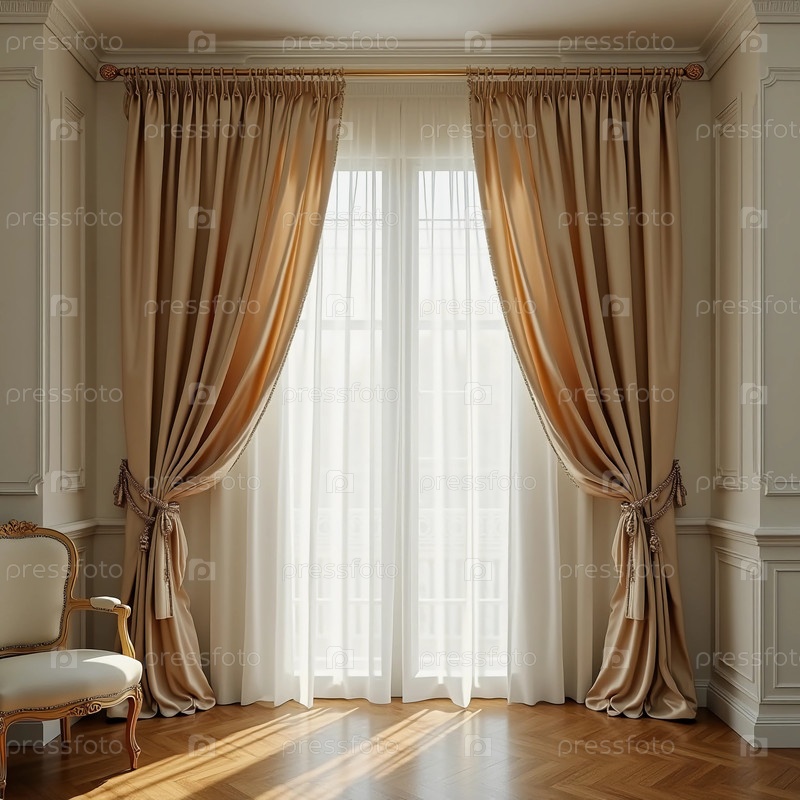 В красиво назначенной комнате роскошные шелковые шторы мягко обрамляют большие окна, позволяя мягкому солнечному свету фильтроваться, создавая привлекательную и спокойную атмосферу