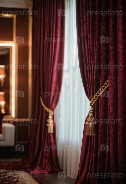 Шелковые шторы изящно драпируются над большим окном, позволяя мягкому свету проникать в роскошную комнату, наполненную классическим декором. Глубокие цвета и роскошные детали приносят тепло