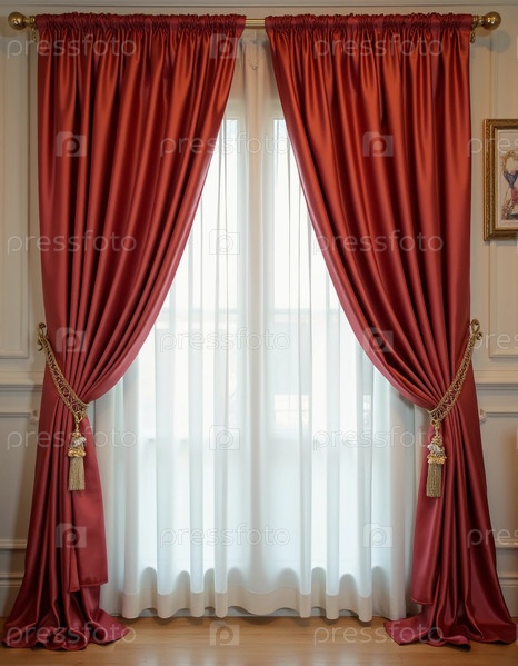 Громкие шелковые шторы в глубоком красном каскаде изящно украшены богато декорированными кистями.Солнечный свет фильтрует через чистые занавески, создавая привлекательную атмосферу в элегантной комнате Generative AI