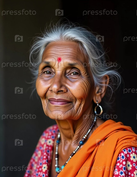 Пожилая женщина из Индии источает тепло, когда она мягко улыбается, украшенная красочной традиционной одеждой