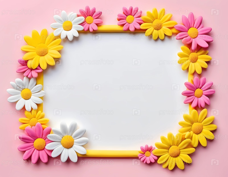 Яркий массив белых, желтых и розовых маргариток образует восхитительную границу, окружающую пустое пространство, которое приглашает к личному выражению и творчеству. Идеально подходит для любых художественных начинаний