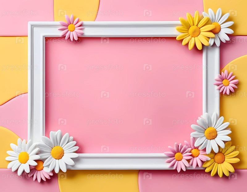 Белый каркас, украшенный яркими желтыми и розовыми маргаритками, покоится на пастельном фоне. Пустое пространство манит творчество и художественное выражение в безмятежной атмосфере