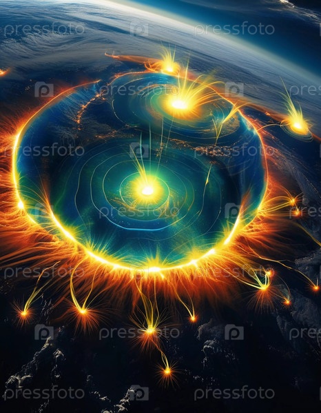 Яркое проявление огненной вспышки захватывает атмосферу, бросая огневые следы по небу.Это потрясающее зрелище демонстрирует неочищенную красоту природы в увлекательном событии Generative AI