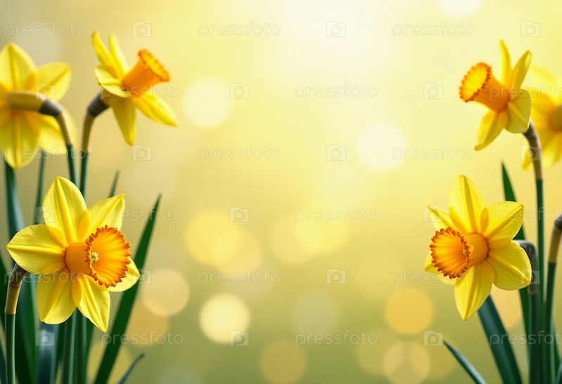 Яркие цветы нарцисса лопаются от радости, их ярко-желтые лепестки освещаются теплым, золотистым фоном боке. Мягкий солнечный свет фильтруется, создавая спокойную атмосферу в спокойном саду. Сцена приглашает моменты размышлений и наслаждений, так как нежны