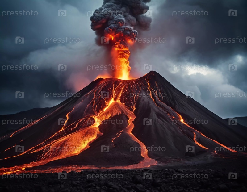 Вдохновляющий страх вулкан извергается, извергая горячую магму в воздух, в то время как потоки лавы ярко светятся по его прочным склонам. Темные облака кружатся над головой, создавая потрясающий фон