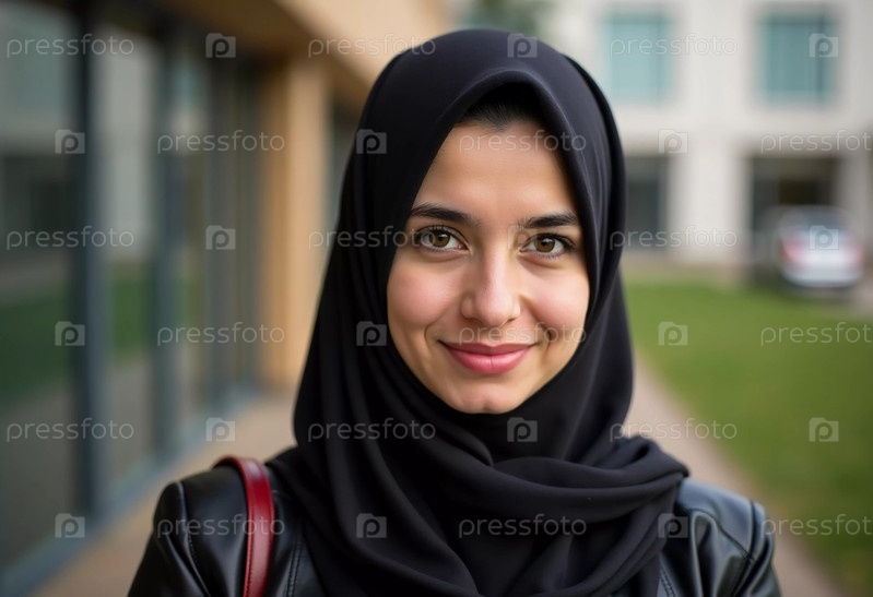 Молодая мусульманка гордо стоит в Газе, ее черный хиджаб контрастирует с современным зданием. Она носит теплую улыбку, источающую уверенность и изящество в своем окружении