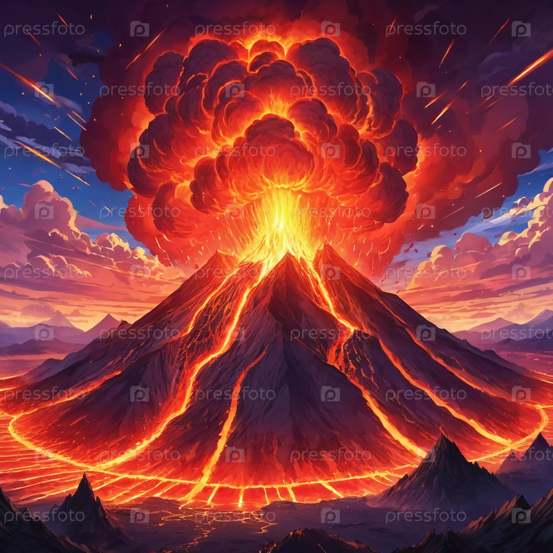 Потрясающее извержение вулкана пленяет зрителей, когда расплавленная лава течет по склонам, посылая огненные облака, вздымающиеся в небо. Окружающие горы создают драматический фон