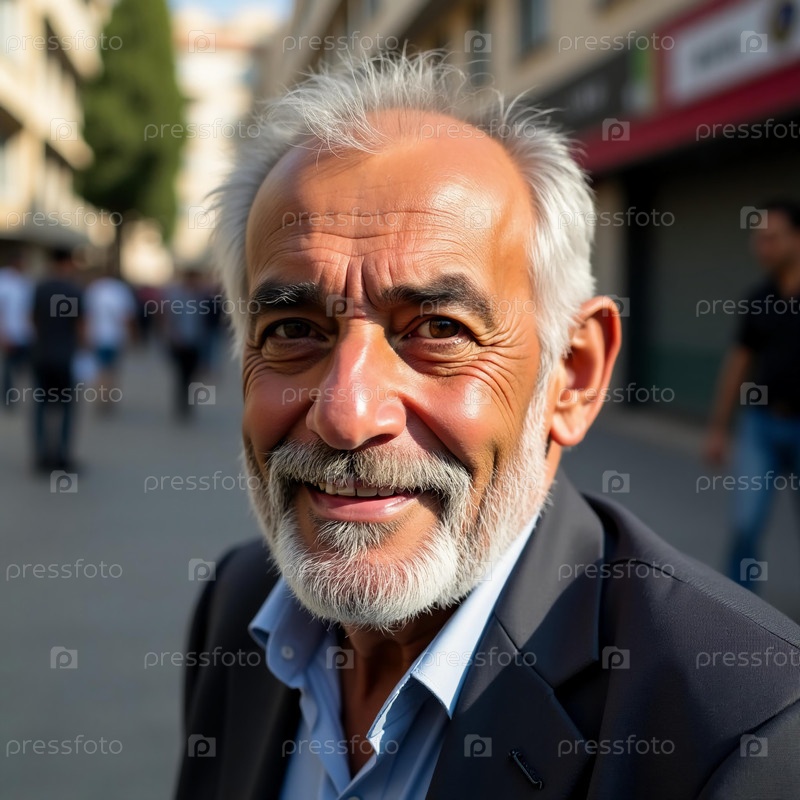 Радостный человек с белой бородой стоит на шумных улицах Газы, излучая тепло и дружелюбие, когда он общается с прохожими в повседневной сцене