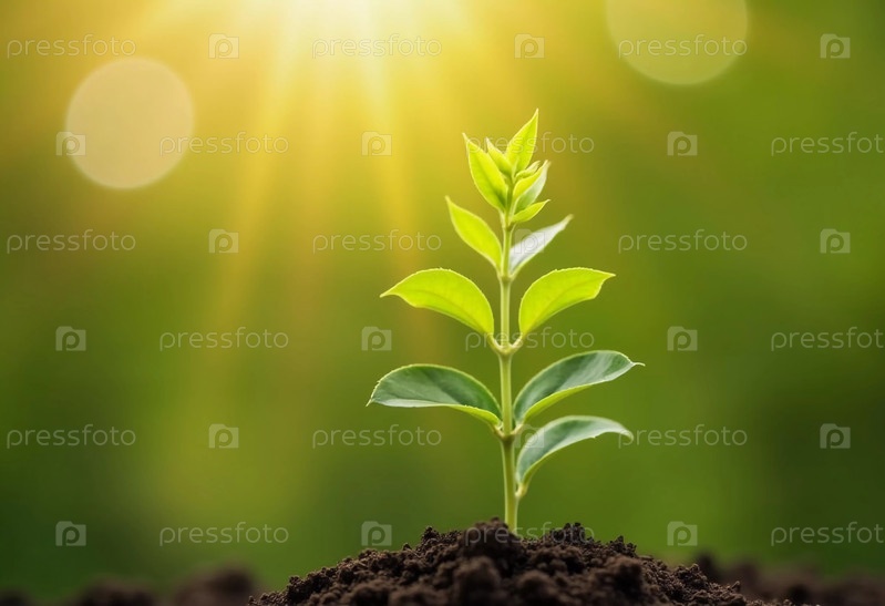 В безмятежном открытом пространстве небольшое растение выходит из богатой почвы, греясь на мягком солнечном свете. Новые листья растягиваются вверх, символизируя рост и надежду