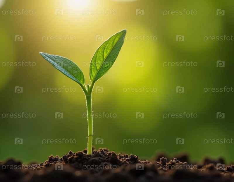 Купаясь под теплым солнечным светом, молодое растение выходит из богатой темной почвы, демонстрируя свои нежные листья, когда оно достигает неба в спокойной естественной обстановке, символизирующей рост и надежду