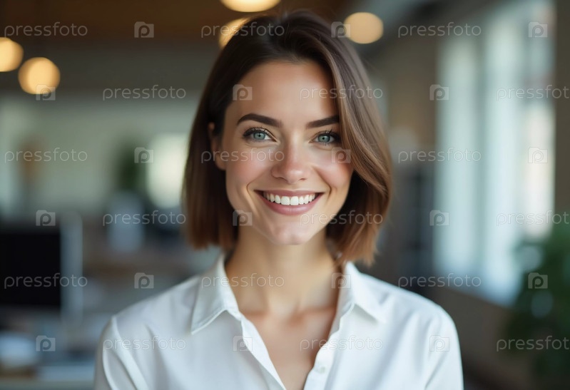 Женщина с брюнетками тепло улыбается, обеспечивая отличное обслуживание клиентов в современном офисе банка. Естественный свет заполняет пространство, усиливая ее привлекательное поведение