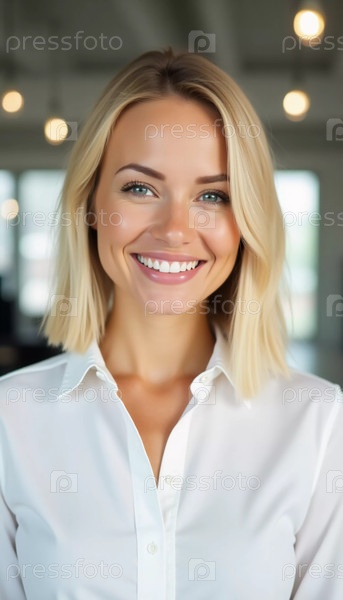 Веселая блондинка в белой рубашке тепло улыбается, демонстрируя отличное обслуживание клиентов в современном банковском офисе, наполненном естественным светом