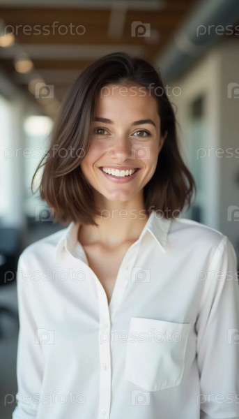 Брюнетка с дружественной улыбкой уверенно стоит в гладком офисе банка Generative AI