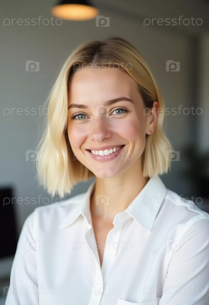 Веселая блондинка в белой рубашке предлагает теплый и дружелюбный сервис в стильном офисе банка, наполненном естественным светом. Она излучает позитив и профессионализм Генерирующий ИИ
