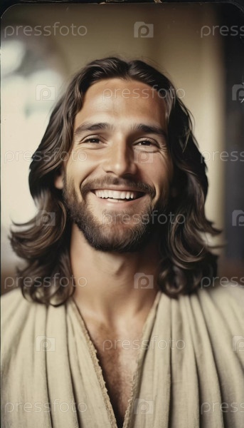 Добрый человек с длинными волосами и нежной улыбкой излучает тепло, окруженный мирной атмосферой. Мягкий свет усиливает его безмятежное выражение, вызывая чувства радости и любви Генеративный ИИ