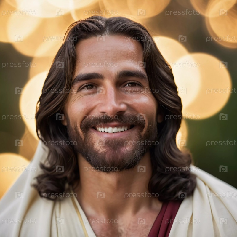 Безмятежный момент, запечатленный, когда Иисус Христос тепло улыбается, окруженный мягким золотым светом, который усиливает мирную атмосферу, приглашая связь и отражение