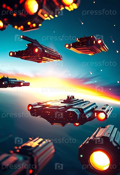 Футуристические космические корабли перемещаются по бесконечному космосу, освещая темноту яркими тропами, когда они исследуют Вселенную во время потрясающего сумеречного явления Generative AI
