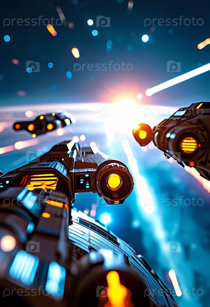 Среди огромного космоса, гладкие космические корабли пересекают галактику, их двигатели ярко светятся, когда они стреляют через звездную пустоту, разделяя чудеса исследования Генеративного ИИ