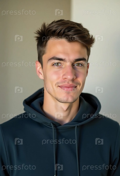 Молодой человек из Чечни уверенно стоит в современной обстановке, надев случайный костюм и испуская теплую улыбку Generative AI