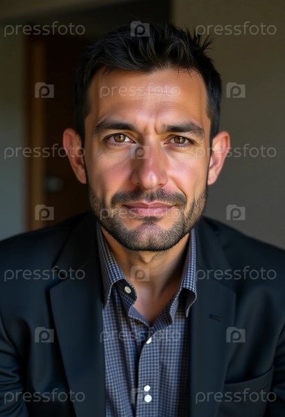 Ухоженный чеченец, одетый в умную черную куртку и клетчатую рубашку, уверенно смотрит на зрителя. Фон может похвастаться теплым, нейтральным тоном, добавляя глубину к моменту Генеративного ИИ