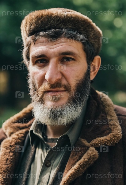 Зрелый мужчина из Чечни уверенно стоит, демонстрируя поразительную бороду и традиционный наряд Generative AI