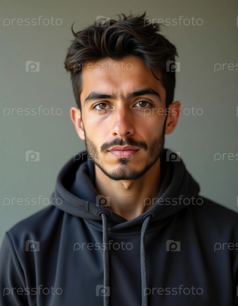 Этот поразительный портрет запечатлел молодого человека из Чечни, подчеркнув его уверенное поведение и уникальные черты. Нейтральный фон добавляет к общей сути момента Генеративный ИИ