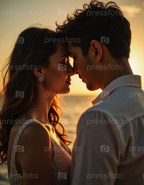 На пляже пара наслаждается романтическим моментом, когда они наклоняются вплотную во время потрясающего заката. Теплый золотой свет усиливает их интимную связь, окруженную спокойствием