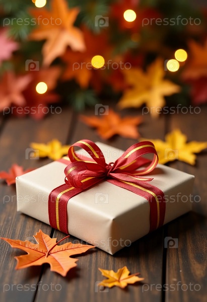 Прекрасно завернутый подарок сидит на деревенской деревянной поверхности, окруженной яркими осенними листьями в оттенках оранжевого и желтого
