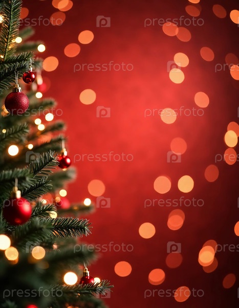 Ярко освещенная рождественская елка, украшенная красными орнаментами, стоит на теплом фоне боке, создавая жизнерадостную праздничную атмосферу для приветствия Нового года Generative AI