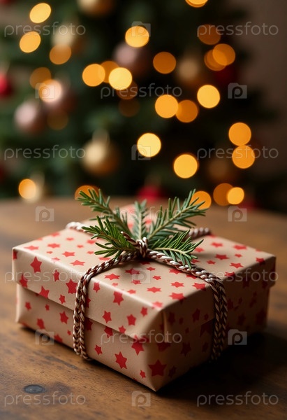 Очаровательный подарок покоится на деревянном столе, украшенном праздничной оберткой и веткой зелени сверху, установленной на фоне светящейся рождественской елки