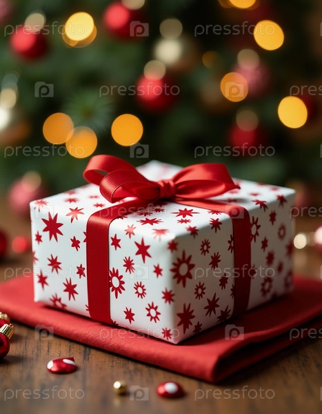 Потрясающий рождественский подарок покоится на яркой красной ткани, красиво завернутой в белую бумагу с красными звездами