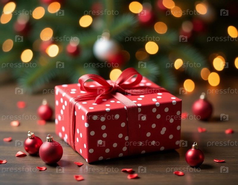 Обернутый в веселый красный с белыми точками польки, подарок покоится на деревянной поверхности, окруженной орнаментами и праздничными украшениями, запечатлев дух новогодних торжеств