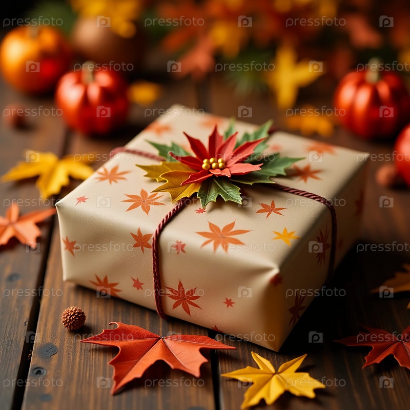 Прекрасно завернутый подарок сидит в окружении ярких осенних листьев и очаровательных тыкв, воплощая суть Хэллоуина и уютное тепло осенних праздников
