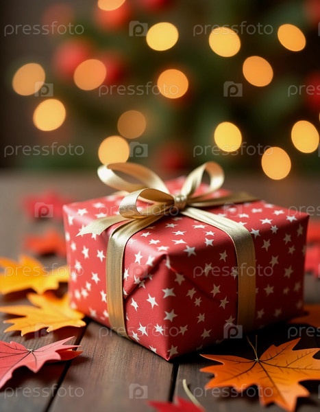 Восхитительный подарок, завернутый в праздничную бумагу и украшенный золотой лентой, сидит среди красочных осенних листьев