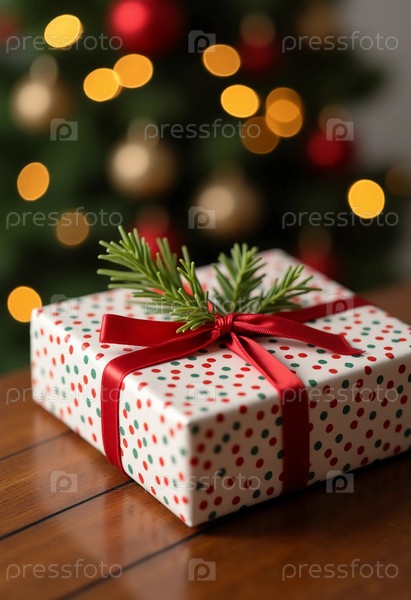 Восхитительный подарок с красочными точками польки и красной лентой покоится на теплом деревянном столе, готовом принести радость во время праздничных торжеств нового года и Рождества