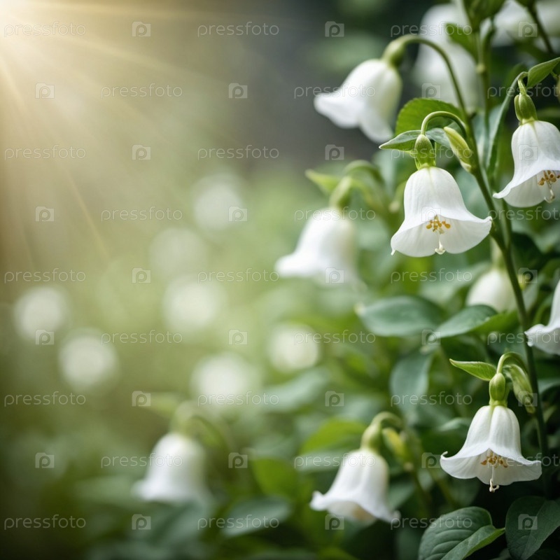Белые синие колокольчики цветут в пышном зеленом лесу. Яркий контраст против богатой листвы. Красивая природная сцена. Вне фокуса фон. Глубина и спокойствие. Сгенерированный ИИ. Копируйте пространство для текста