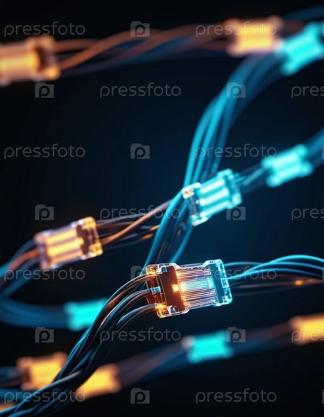Синие и оранжевые светящиеся провода скручиваются и переплетаются на темном фоне с боке. Черные кабели и разъемы со светящимися огнями и цепями соединяются, чтобы сформировать сеть. генерируемый