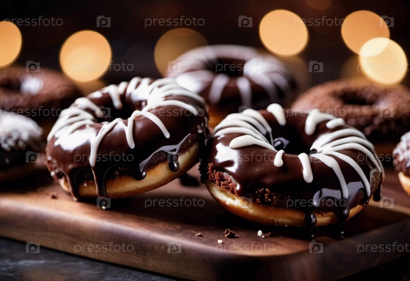 Свежесделанные шоколадные пончики с богатой глазурью и кремовой начинкой сидят на пергаментной бумаге. Они представлены на столе, демонстрируя их восхитительный внешний вид. Какао-коричневая глазурь на булочках. Генерирующий ИИ
