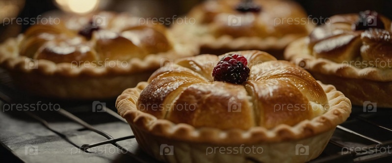 Свежеиспеченные выпечки и пироги привлекательно расположены на столе в теплой пекарне. Их золотые коричневые корки имеют красиво обработанные конструкции, увенчанные пылью сахара. Генерирующий ИИ