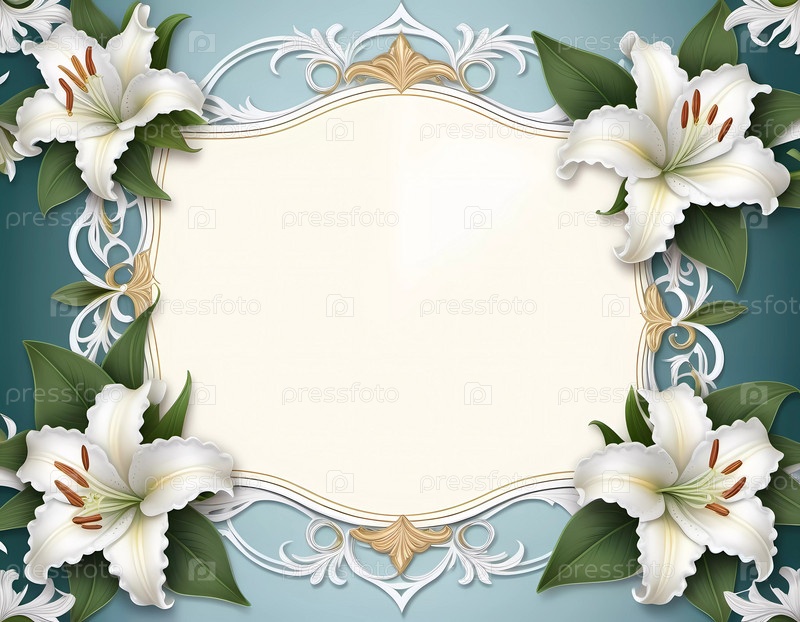 Очаровательные белые лилии с зелеными листьями создают тонкую границу вокруг пустого пространства, идеально подходящую для добавления персонализированных сообщений или дизайнов. Генеративное искусство. Копируйте место, поздравительная открытка