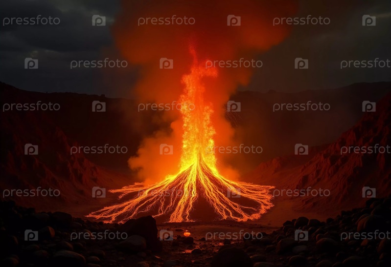 Горячая магма вырывается из вулкана, создавая светящиеся реки расплавленной породы, которые каскадируются по склонам, в то время как дым дует в ночное небо